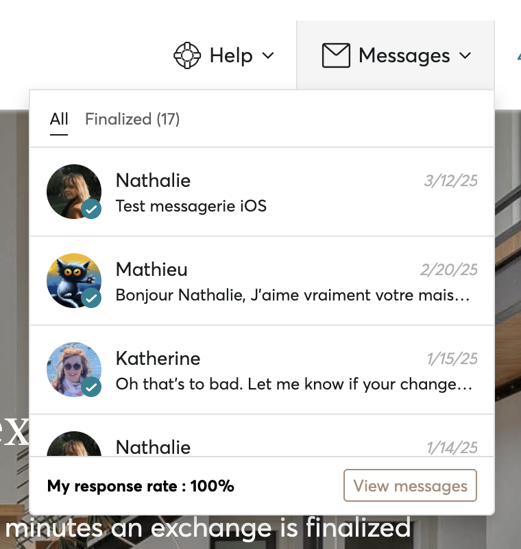 Every time you contact a member of the community or a member contacts you, HomeExchange creates a conversation and sends you an email notification so you can arrange the details of the exchange. This conversation can be found in your HomeExchange messages.