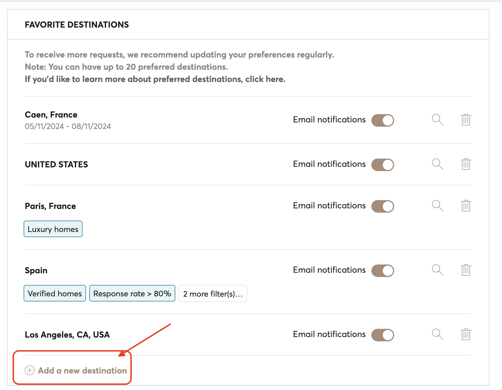 Once there, you will be able to see all your destinations and/or add new ones. To add a preferred destination, simply click on "Add a new destination".