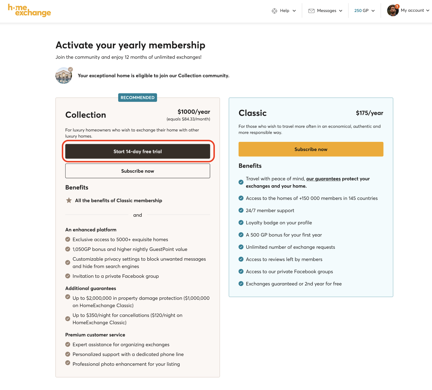 Currently, the free trial is available only to HomeExchange members who do not currently have an active paid HomeExchange membership. Additionally, your home must meet the eligibility criteria for joining HomeExchange Collection.