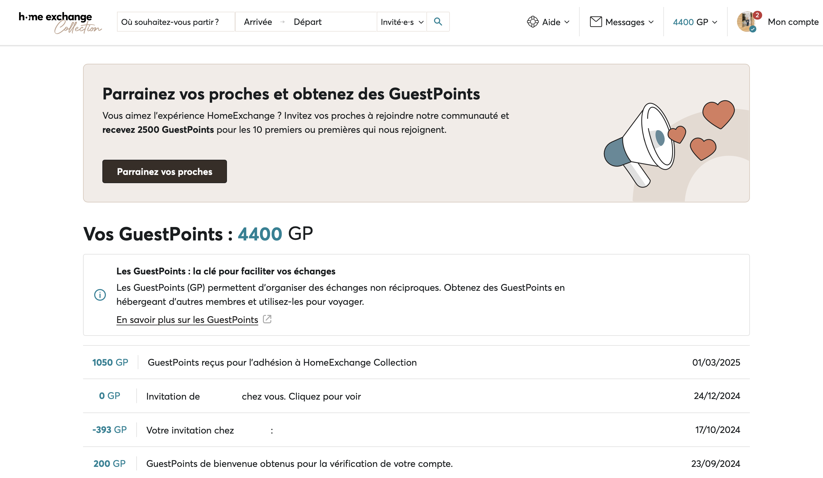GuestPoints recibidos por referir amigos o alojar a otros miembros