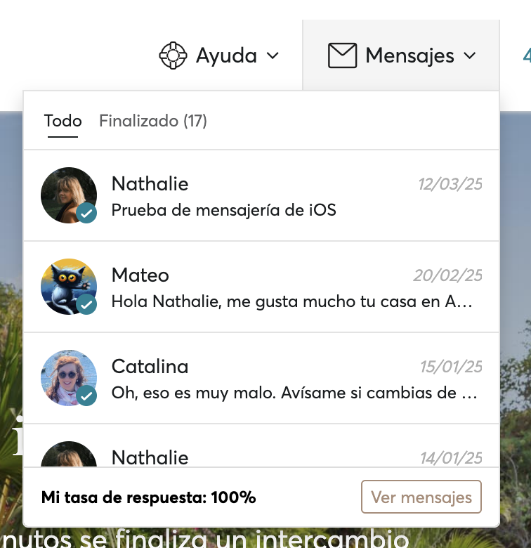 Cada vez que contactas a un miembro o que un miembro te contacta, HomeExchange crea una conversación y te envía una notificación por correo electrónico para que podáis organizar los detalles del intercambio. Puedes encontrar esta conversación en tus mensajes de HomeExchange.