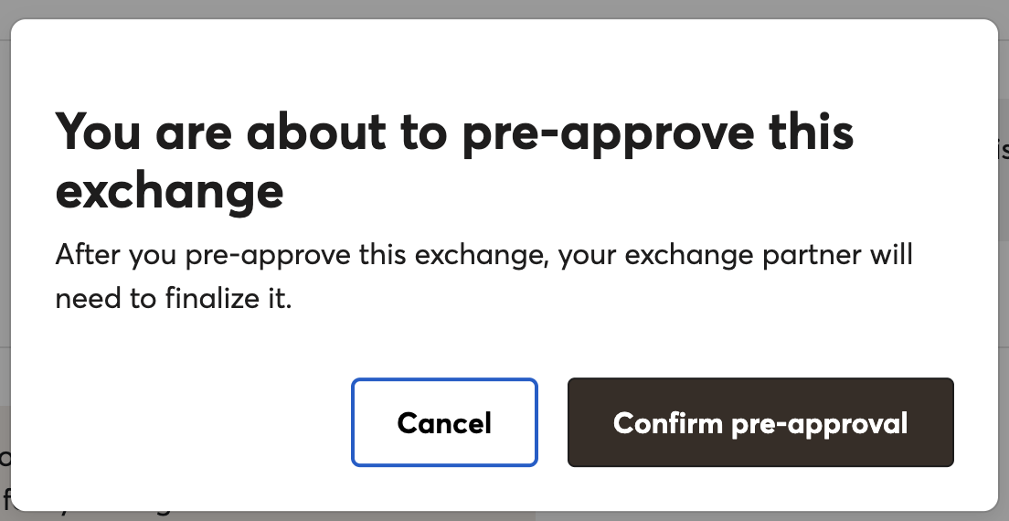 Una vez que ambos hayan acordado los detalles, uno de los dos debe pre-aprobar el intercambio haciendo clic en el botón naranja "Pre-aprobar" en la parte inferior derecha de los detalles del intercambio. Al hacerlo, aparecerá una nota avisando que estás a punto de pre-aprobar el intercambio.
