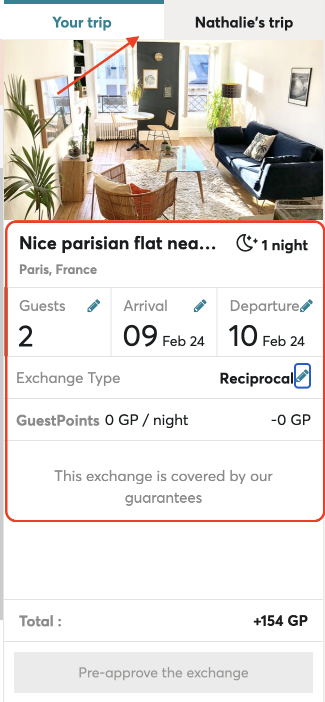 Puedes añadir o actualizar otros detalles (fechas, número de viajeros, GuestPoints) tanto de tu viaje como del de tu invitado en las pestañas "Tu viaje" y "El viaje de X".