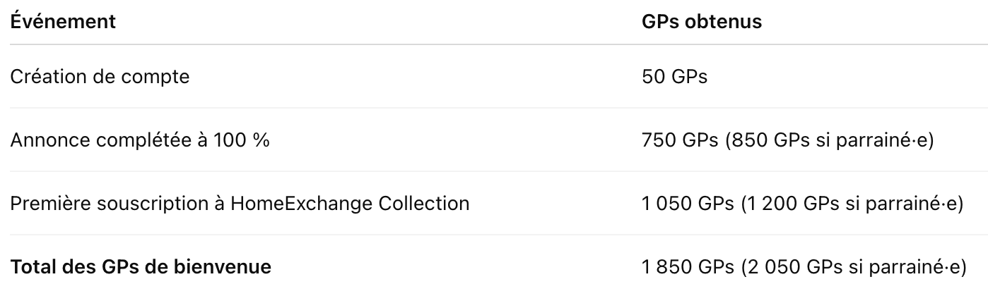 Il existe plusieurs façons de gagner des GuestPoints (GPs) pour voyager via HomeExchange Collection.