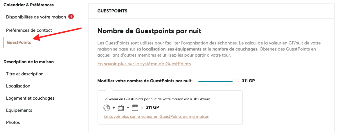 Une fois sur la page de votre annonce, faites défiler la barre latérale jusqu’à la section «GuestPoints». Vous y verrez le nombre de GuestPoints attribués automatiquement à votre logement, selon les informations renseignées dans votre annonce (surface, équipements, couchages, localisation…).