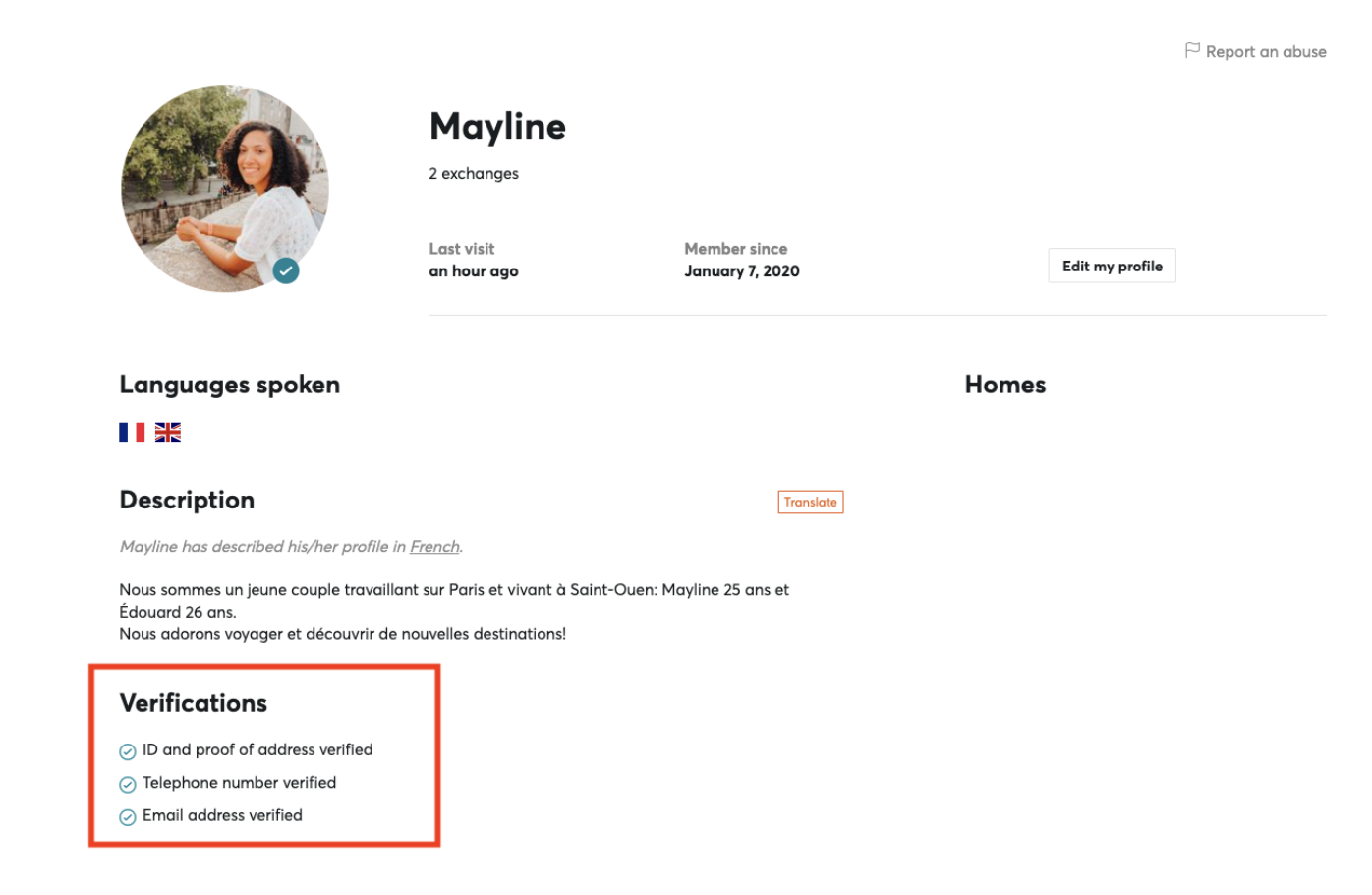 Sur son profil, vous trouverez sa description, les langues qu'il parle, etc., et il y a également une section qui indique les types de vérification effectuées. Si une coche apparaît à côté d'un composant, cela signifie qu'il a été vérifié par HomeExchange.